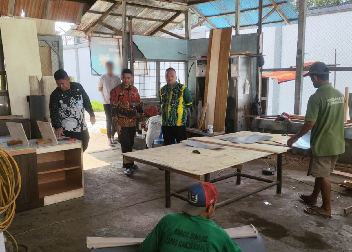 Kepala Lapas Kelas IIA Banjarmasin, Akhmad Herriansyah, meninjau langsung kegiatan produksi di Bengkel Kerja Lapas, Kamis (09/10). Dalam kunjungan tersebut, Kalapas didampingi oleh Kasi Kegiatan Kerja, Hazairin, serta petugas giatja lainnya.