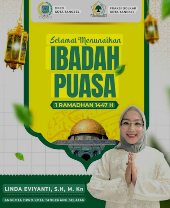 Anggota DPRD Kota Tangerang Selatan dari Fraksi Partai Golkar, Linda Eviyanti, S.H., M.Kn., menyampaikan ucapan selamat menunaikan ibadah puasa kepada seluruh umat Muslim yang menjalankan ibadah di bulan suci Ramadhan 1447 Hijriah.