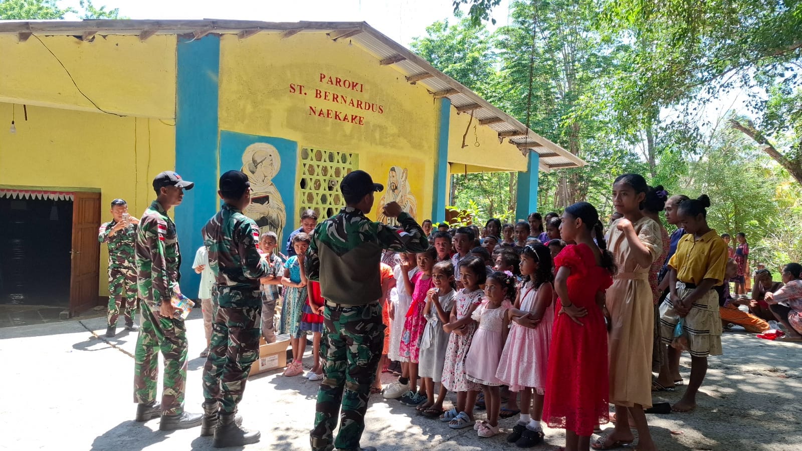 Selain itu, Personel Satgas juga menyerahkan Alkitab kepada anak-anak jemaat Gereja St. Bernandus sebagai bentuk dukungan terhadap pembinaan mental dan spiritual generasi muda di perbatasan.