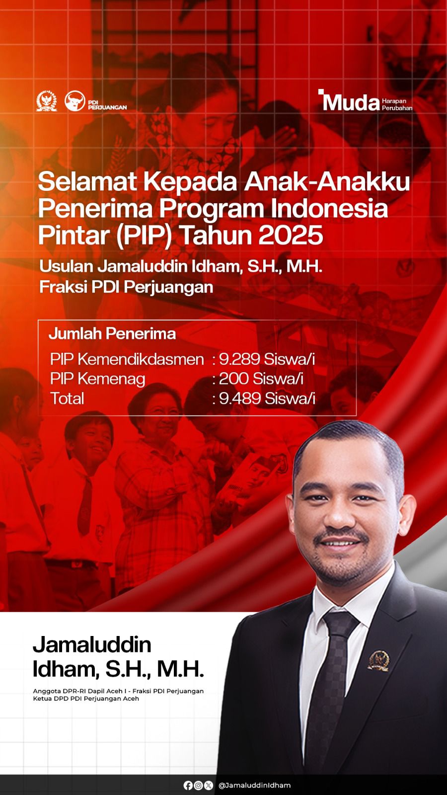 Banda Aceh – Kabar gembira datang bagi ribuan pelajar di Aceh. Beasiswa Program Indonesia Pintar (PIP) tahap kedua usulan Anggota DPR RI sekaligus Ketua DPD PDI Perjuangan Aceh, Jamaluddin Idham, SH, MH resmi cair pada Desember 2025.