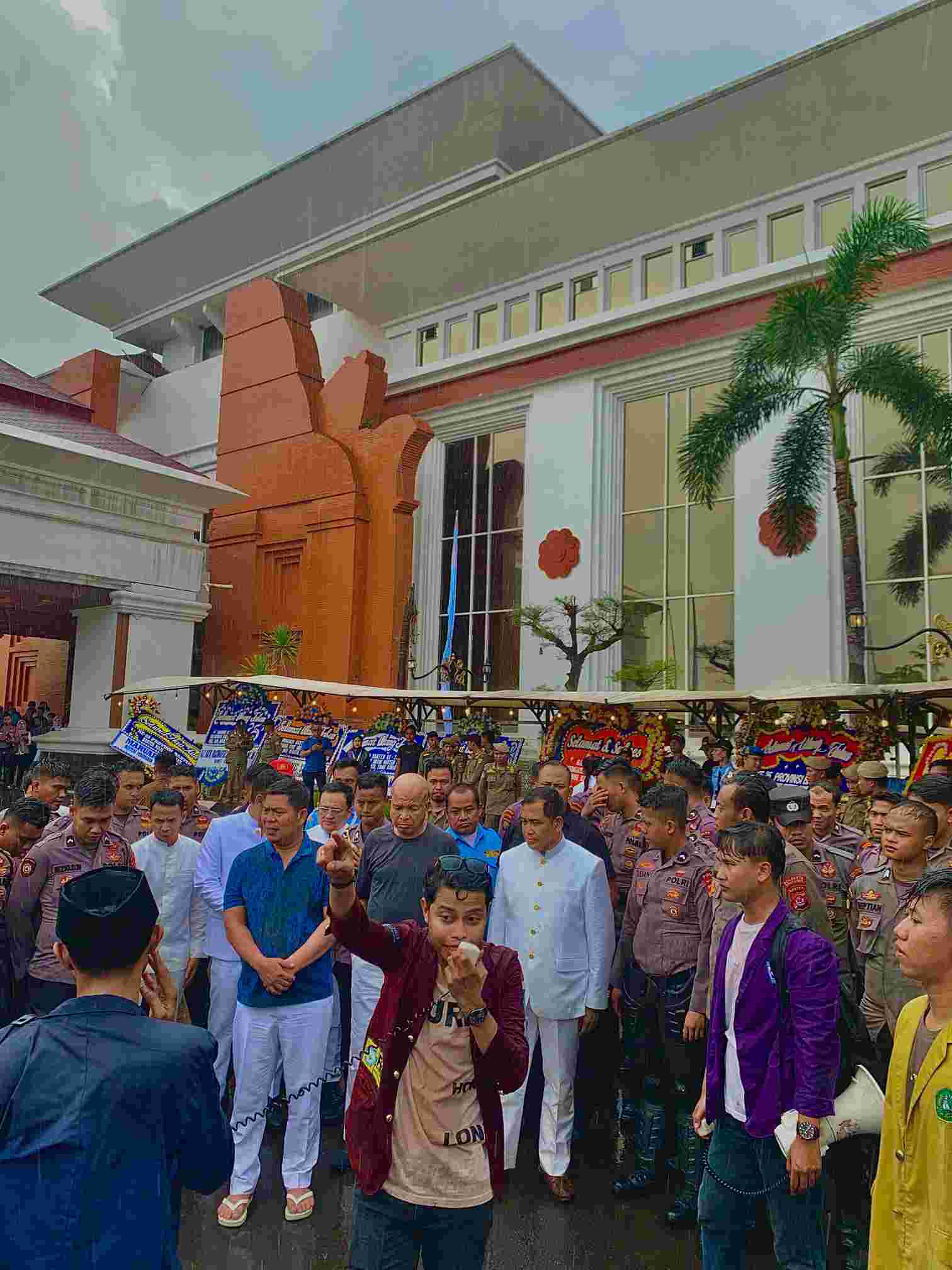 ‎Meski diguyur hujan deras, para mahasiswa tetap bersemangat menyuarakan aspirasi rakyat dan menyerukan evaluasi terhadap berbagai kebijakan pemerintah daerah.