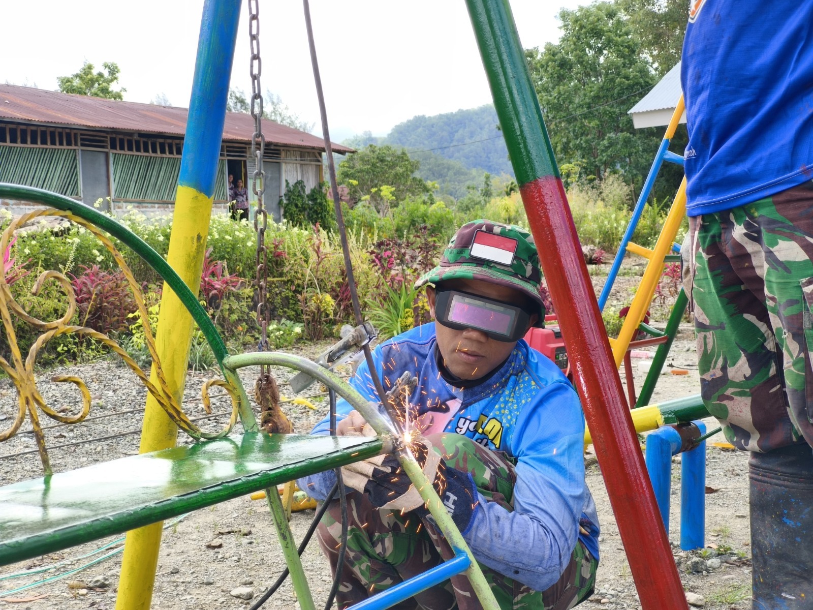 Eban – Dengan semangat kebersamaan untuk mewarnai sekolah di perbatasan, personel Makosatgas Pamtas RI-RDTL Sektor Barat Yonarhanud 2 Kostrad melaksanakan renovasi dan perbaikan TK Dharma Wanita yang berada di Desa Eban, Kec. Miomaffo Barat, Kab. TTU. Senin (20/04)
