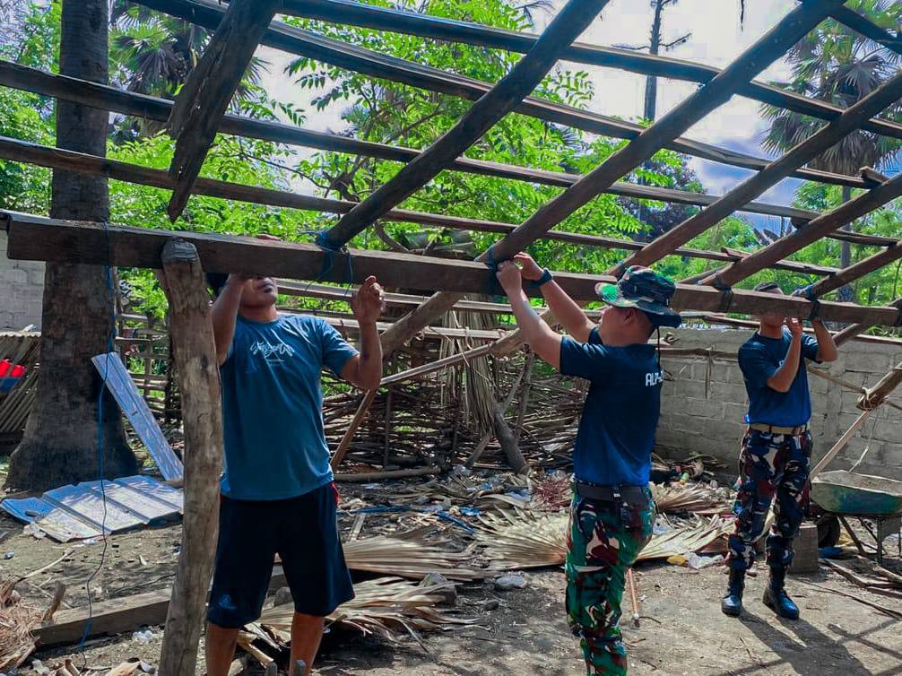 Wini – Wujud kepedulian dan kemanunggalan TNI dengan rakyat terus ditunjukkan oleh Satgas Pamtas RI–RDTL Sektor Barat Yonarhanud 2 Kostrad Pos Wini dengan melaksanakan kegiatan membantu pemasangan atap rumah menggunakan daun lontar milik salah satu warga di Desa Wini, Kec. Insana Utara, Kab. TTU, Jumat (02/01)