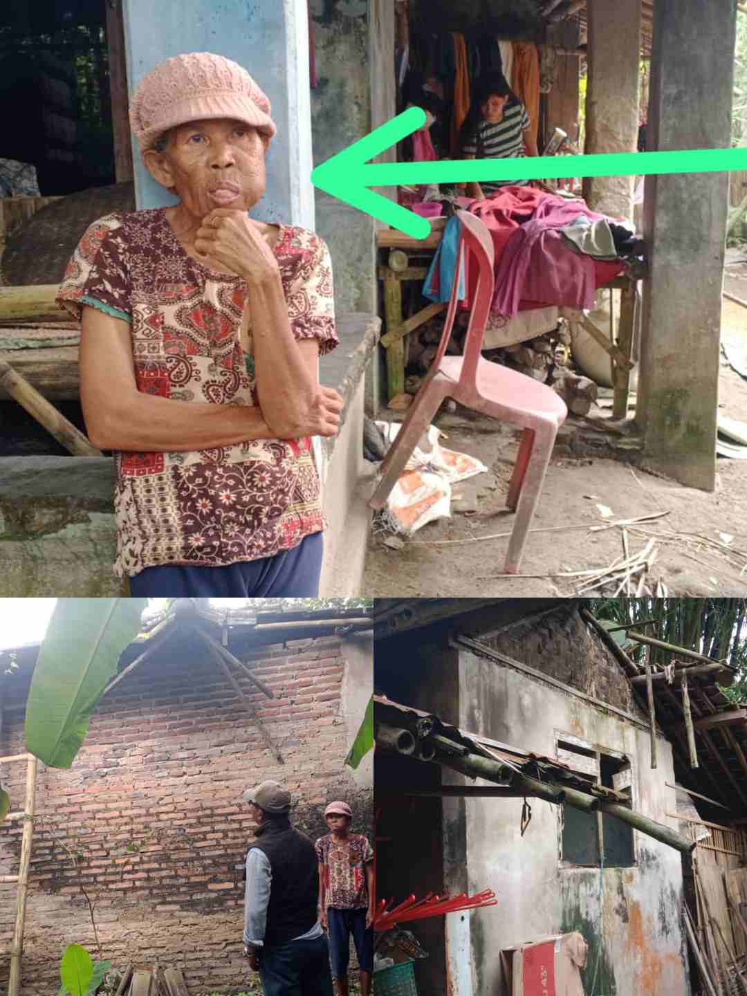 Sanamah seorang ibu rumah tangga hidup dalam keterbatasan bersama seorang anak dan cucunya. Dengan suara terbata-bata, ia menceritakan kondisi rumahnya yang memprihatinkan kepada awak media.