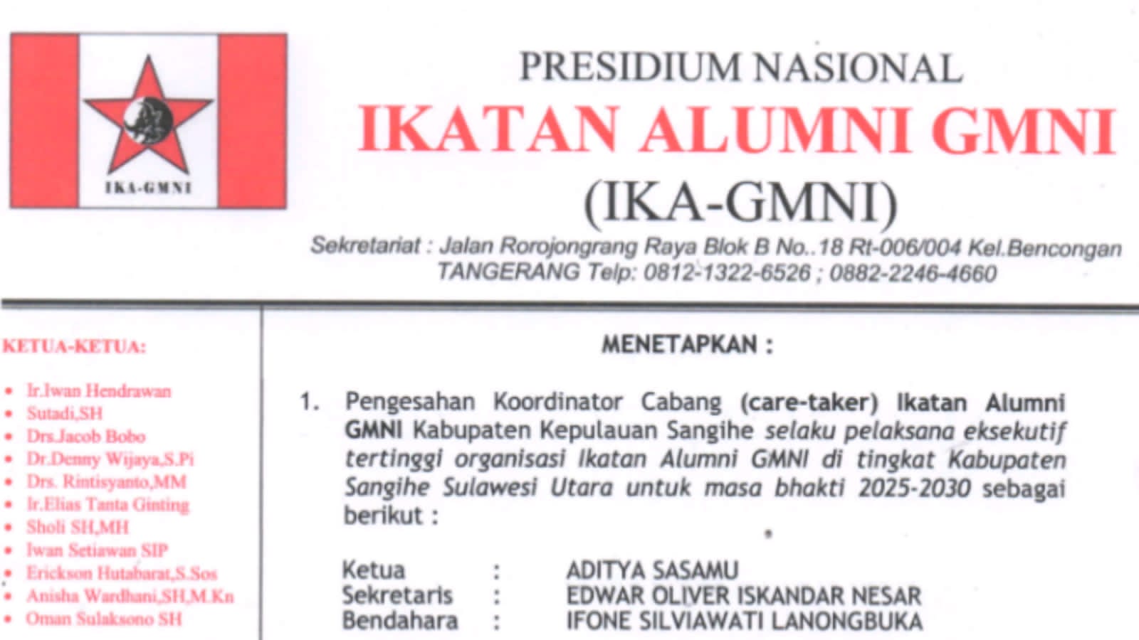 Melalui SK Nomor: 148/SK/Presnas/IKA-GMNI/XI/2025 tentang Pengesahan Koordinator Cabang Ikatan Alumni GMNI Kabupaten Kepulauan Sangihe Sulawesi Utara.