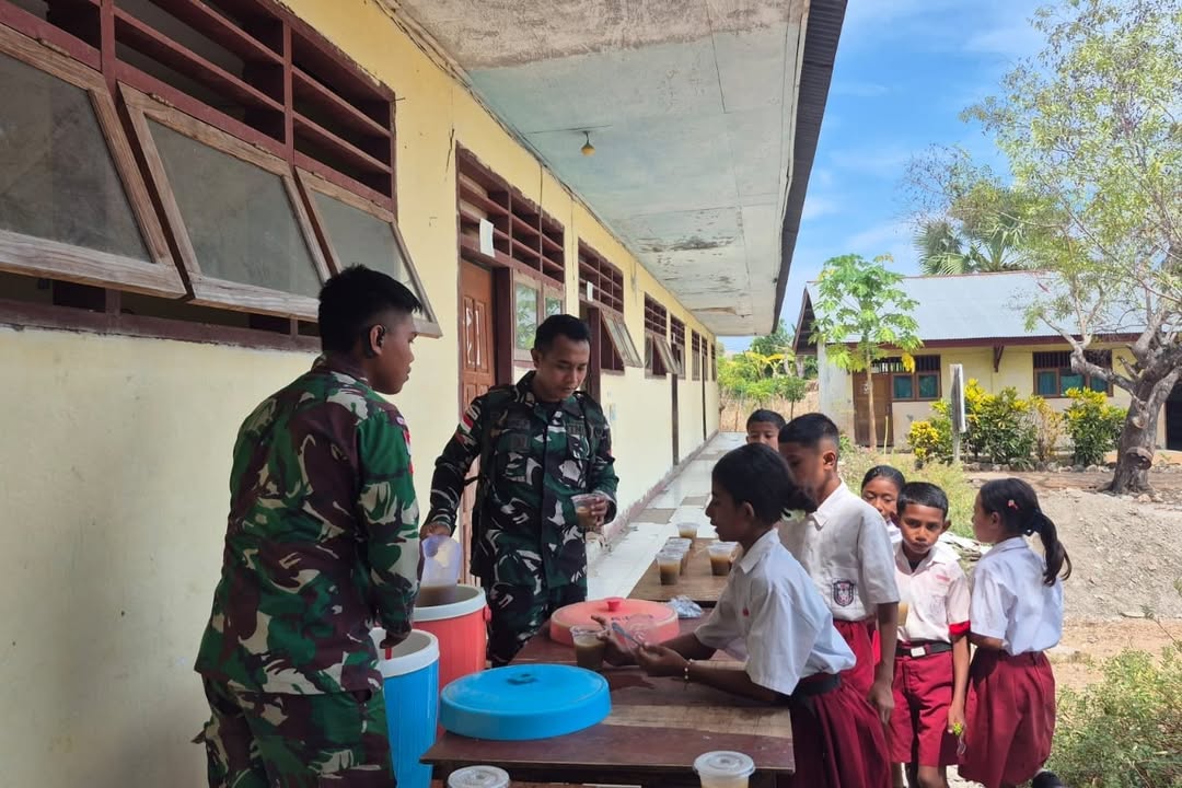 Netemnanu – Prajurit Satgas Pamtas RI-RDTL Sektor Barat Yonarhanud 2 Kostrad Pos Oepoli Pantai adakan kegiatan berbagi bubur bergizi bagi siswa SD Netemnanu Utara, Kec. Amfoang Timur, Kab. Kupang. Jumat (10/10)