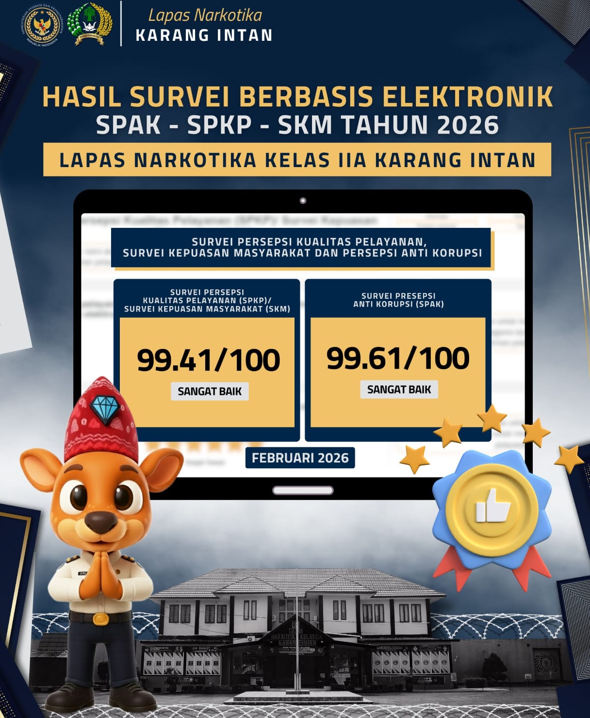 Komitmen dalam memberikan pelayanan prima kepada masyarakat kembali ditunjukkan oleh Lapas Narkotika Kelas IIA Karang Intan. Berdasarkan hasil Survei Persepsi Kualitas Pelayanan (SPKP), Survei Kepuasan Masyarakat (SKM), dan Survei Persepsi Anti Korupsi (SPAK) Triwulan I bulan Februari Tahun 2026, lembaga tersebut memperoleh hasil yang sangat memuaskan dengan predikat Sangat Baik. Rabu, 11 Maret 2026.
