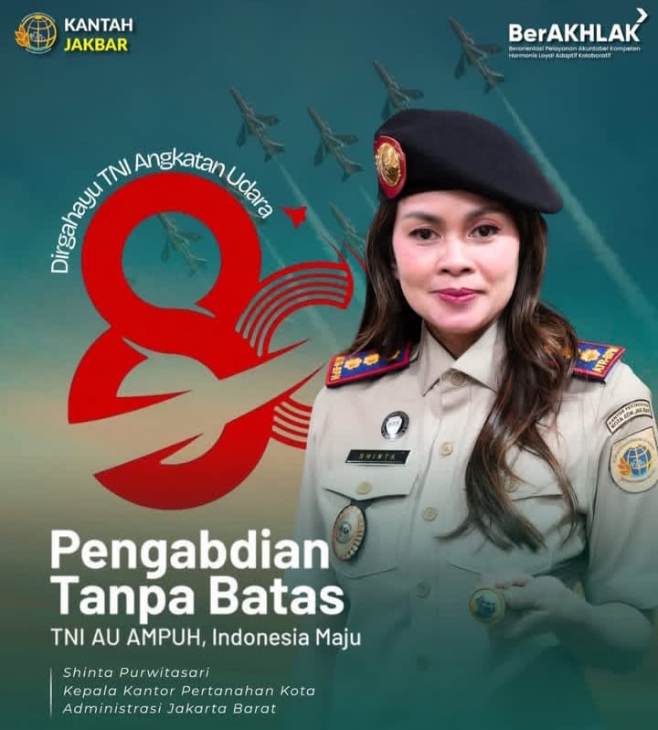 Kantor Pertanahan (Kantah) Kota Jakarta Barat menyampaikan ucapan selamat Hari Ulang Tahun (HUT) ke-80 Tentara Nasional Indonesia Angkatan Udara (TNI AU) sebagai bentuk apresiasi atas dedikasi panjang dalam menjaga kedaulatan udara Indonesia.