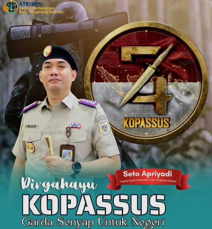 Kantor Pertanahan Kota Tangerang Selatan menyampaikan ucapan selamat dan penghormatan dalam rangka peringatan Hari Ulang Tahun ke-74 Korps Baret Merah. Ucapan tersebut menjadi bentuk apresiasi atas dedikasi dan pengabdian para prajurit dalam menjaga kedaulatan serta keamanan Negara Kesatuan Republik Indonesia.