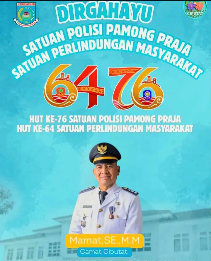 Pemerintah Kecamatan Ciputat menyampaikan ucapan Dirgahayu ke-76 Satuan Polisi Pamong Praja (Satpol PP) dan ke-64 Satuan Perlindungan Masyarakat (Satlinmas). Momentum peringatan ini menjadi refleksi atas peran strategis Satpol PP dan Satlinmas dalam menjaga ketertiban umum serta ketenteraman masyarakat.