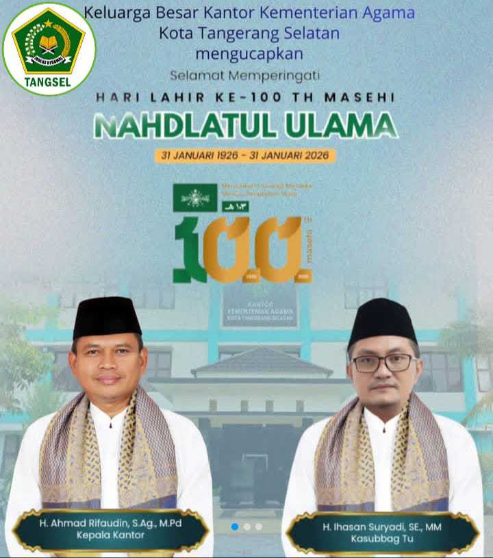 Keluarga Besar Kantor Kementerian Agama (Kemenag) Kota Tangerang Selatan menyampaikan ucapan selamat memperingati Hari Lahir (Harlah) ke-100 Nahdlatul Ulama (NU) yang jatuh pada 31 Januari 2026.