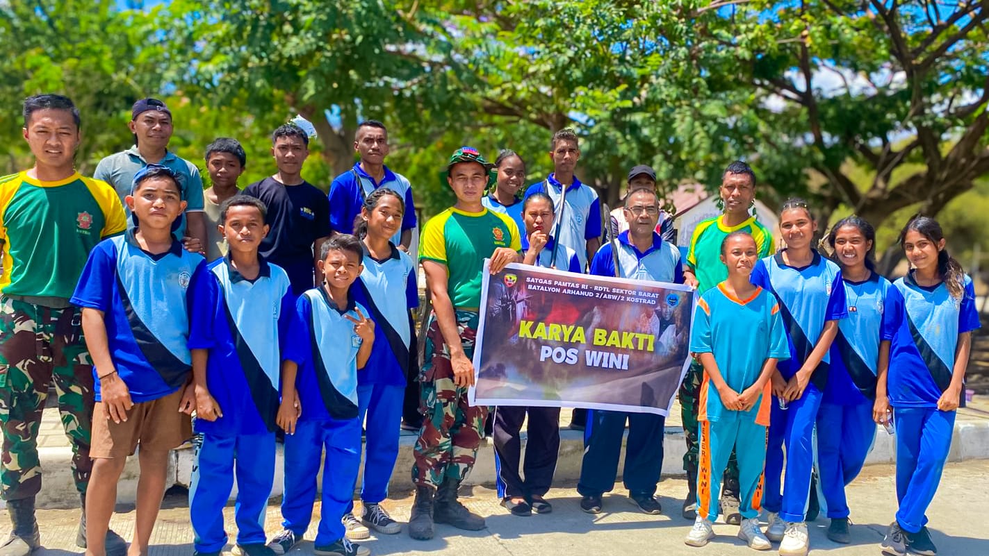 Wini, NTT — Prajurit Satgas Pamtas RI–RDTL Sektor Barat Yonarhanud 2 Kostrad Pos Wini melaksanakan kegiatan Karya Bakti dengan merenovasi pagar SMP Wini di Kecamatan Insana Utara, Kabupaten Timor Tengah Utara (TTU). Jumat (31/10/2025).