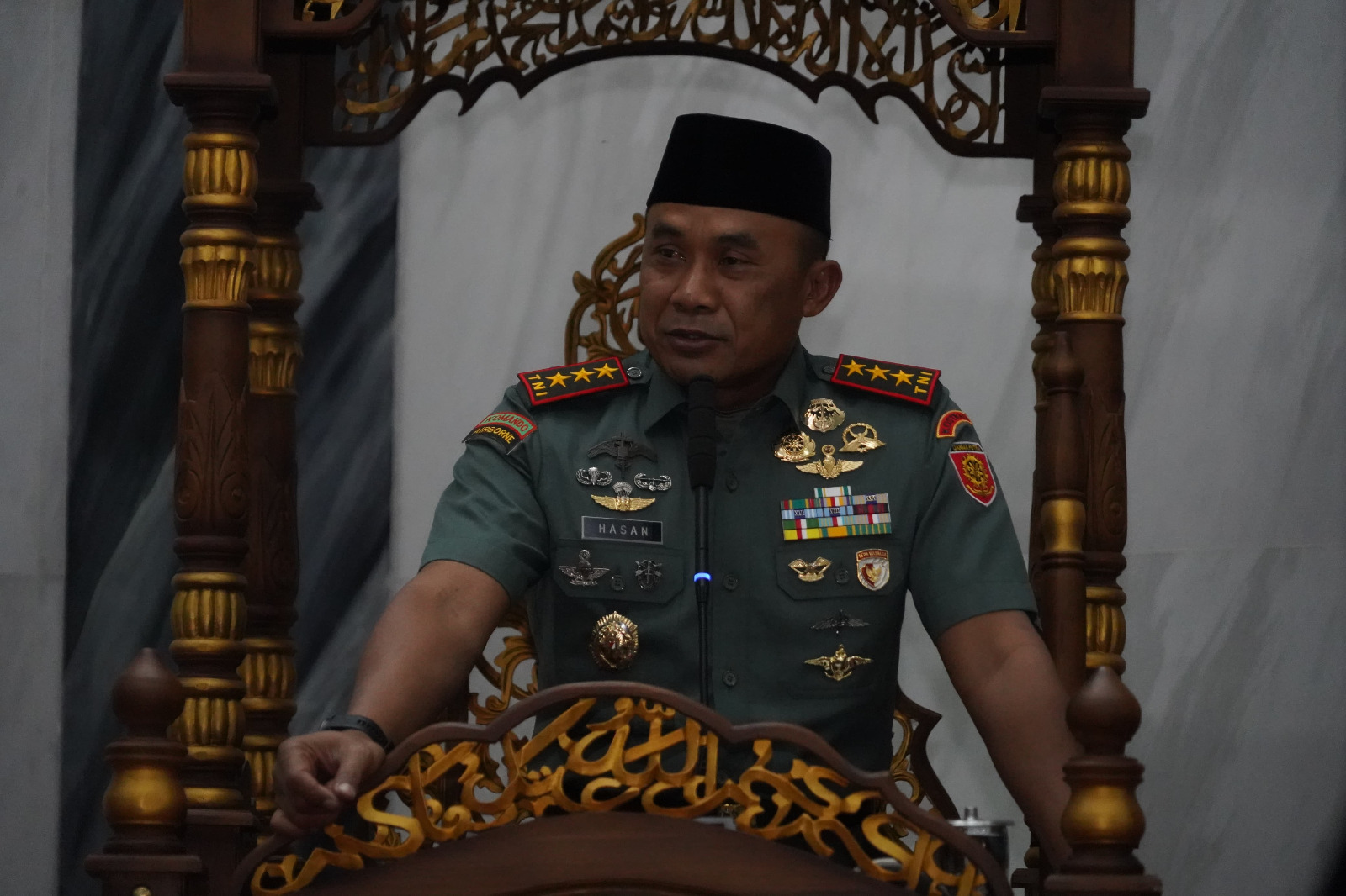 Jakarta. Panglima Kostrad (Pangkostrad), Letnan Jenderal TNI Mohamad Hasan didampingi Ketua Persit Kartika Chandra Kirana Gabungan Kostrad, Ibu Ririx Hasan menghadiri acara peringatan Maulid Nabi Muhammad SAW 1446 H bertempat di Masjid Asy-Syuhada, Markas Kostrad, Gambir, Jakarta Pusat. Kamis (19/9/2024).