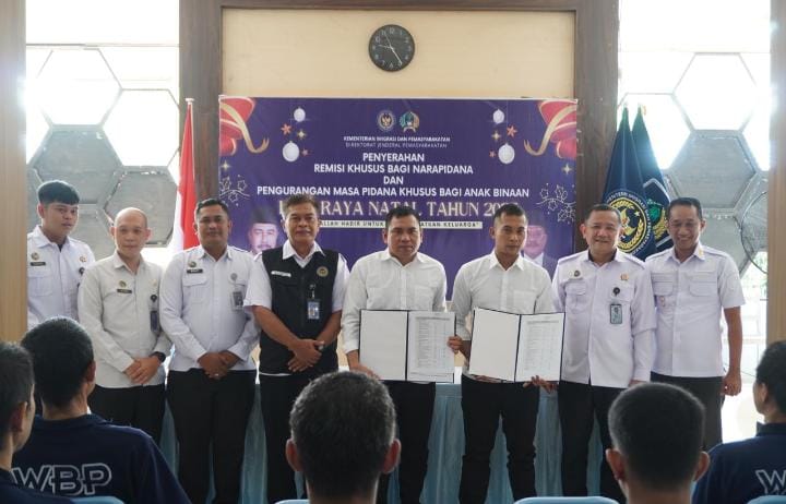 Lembaga Pemasyarakatan (Lapas) Narkotika Kelas IIA Karang Intan menyerahkan Remisi Khusus Hari Raya Natal Tahun 2025 kepada delapan orang narapidana, Kamis (25/12). Penyerahan remisi ini merupakan bentuk penghargaan negara atas perilaku baik serta kepatuhan Warga Binaan dalam mengikuti program pembinaan selama menjalani masa pidana.