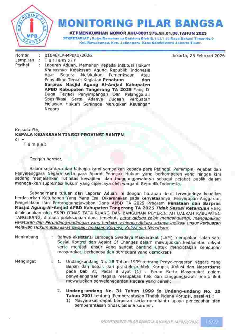 Dengan adanya dugaan tersebut Lembaga Monitoring Pilar Bangsa melayangkan Surat Laporan Aduan ke Kejaksaan Tinggi Banten agar segera melakukan Pemeriksaan atau Penyidikan terkait kegiatan tersebut dengan No tanda terima Lapdu 01046/LP-MPB /11/2026