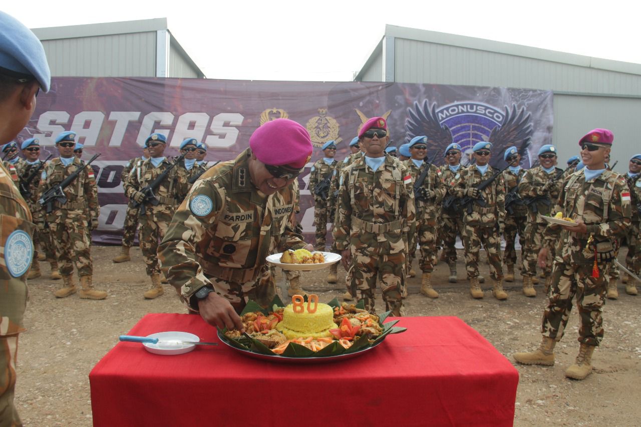Rangkaian peringatan dilanjutkan dengan pemotongan tumpeng oleh Dansatgas sebagai simbol rasa syukur dan kebersamaan, kemudian diserahkan kepada prajurit Korps Marinir yang hadir dalam upacara tersebut. Kegiatan ditutup dengan sesi foto bersama seluruh prajurit Satgas. Dengan semangat “Jalesu Bhumyamca Jayamahe”, Satgas INDO RDB XXXIX-G MONUSCO menegaskan komitmennya untuk terus menjaga nama baik Indonesia serta memberikan kontribusi terbaik bagi perdamaian dunia. (Penkostrad).