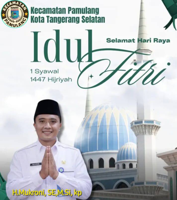 Pemerintah Kecamatan Pamulang, Kota Tangerang Selatan, menyampaikan ucapan selamat Hari Raya Idul Fitri 1447 Hijriah kepada seluruh masyarakat. Ucapan tersebut disampaikan oleh seluruh jajaran Kecamatan Pamulang sebagai bentuk kebersamaan dan kepedulian dalam menyambut hari kemenangan umat Islam.