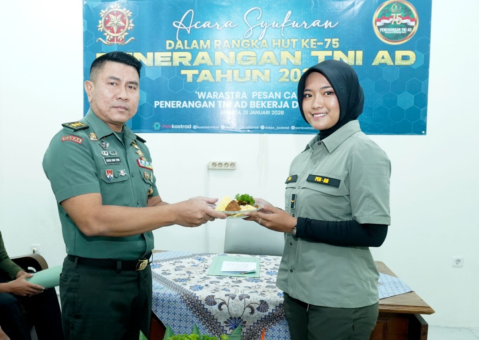 Jakarta — Penerangan Kostrad (Penkostrad) menggelar syukuran Hari Ulang Tahun (HUT) ke-75 Penerangan Angkatan Darat di Kantor Penkostrad, Makostrad, Jalan Medan Merdeka Timur No. 3, Gambir, Jakarta Pusat, Selasa (13/1/2026).