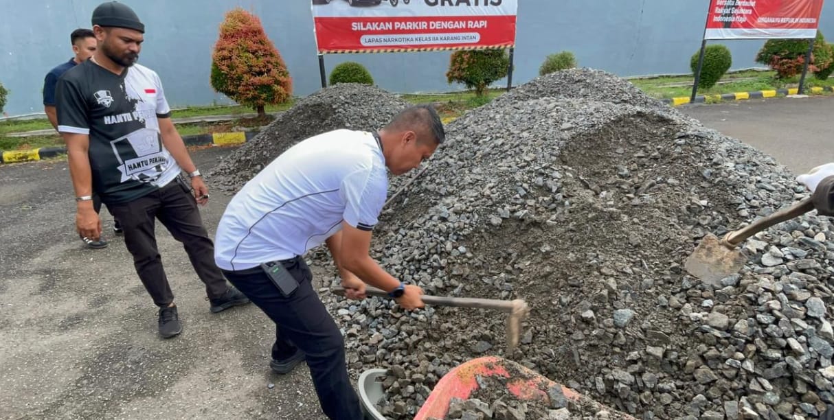 Dalam upaya menciptakan lingkungan kerja yang nyaman dan mendukung kelancaran tugas pengamanan, Kepala Lembaga Pemasyarakatan (Lapas) Narkotika Kelas IIA Karang Intan, Yugo Indra Wicaksi, memimpin langsung kegiatan kerja bakti perbaikan akses jalan dari Pos 1 menuju Pos 2, Sabtu (25/10). Kegiatan tersebut diikuti oleh jajaran pejabat struktural dan pegawai Lapas, yang bersama-sama bergotong royong memperbaiki jalan samping area pengamanan.