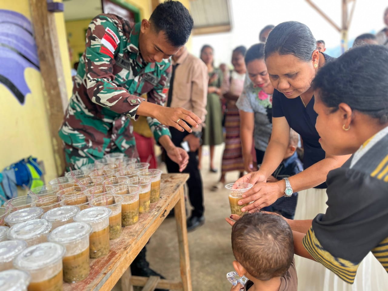 Satgas Pamtas RI–RDTL Sektor Barat Yonarhanud 2 Kostrad Pos Haumeniana melaksanakan kegiatan Minggu Berbagi dengan membagikan bubur bergizi kepada jemaat Gereja Masehi Injili Timor (GMIT) Desa Haumeniana, Kecamatan Bikomi Nilulat, Kabupaten Timor Tengah Utara (TTU), Minggu (14/12/2025).