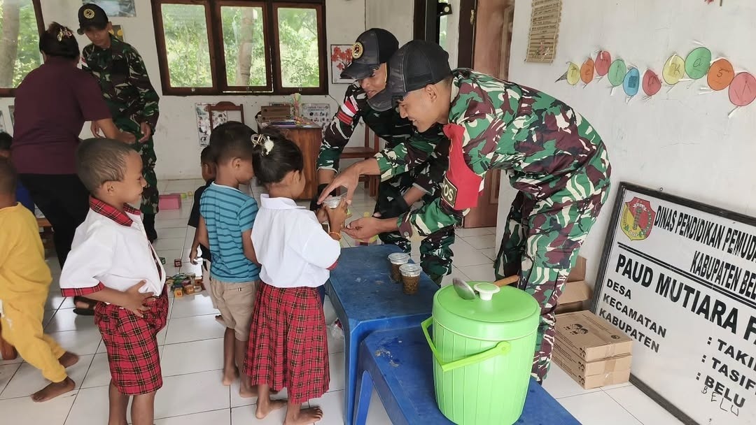 Belu – Satgas Pamtas RI–RDTL Sektor Timur Yonarmed 12 Kostrad melalui Pos Fatubesi Atas melaksanakan kegiatan pembagian bubur kacang hijau kepada anak-anak PAUD di Desa Takirin, Kecamatan Tasifeto Timur, Kabupaten Belu, Rabu (11/02/2026). Kegiatan ini merupakan wujud kepedulian prajurit terhadap kesehatan serta pemenuhan gizi anak-anak di wilayah perbatasan.