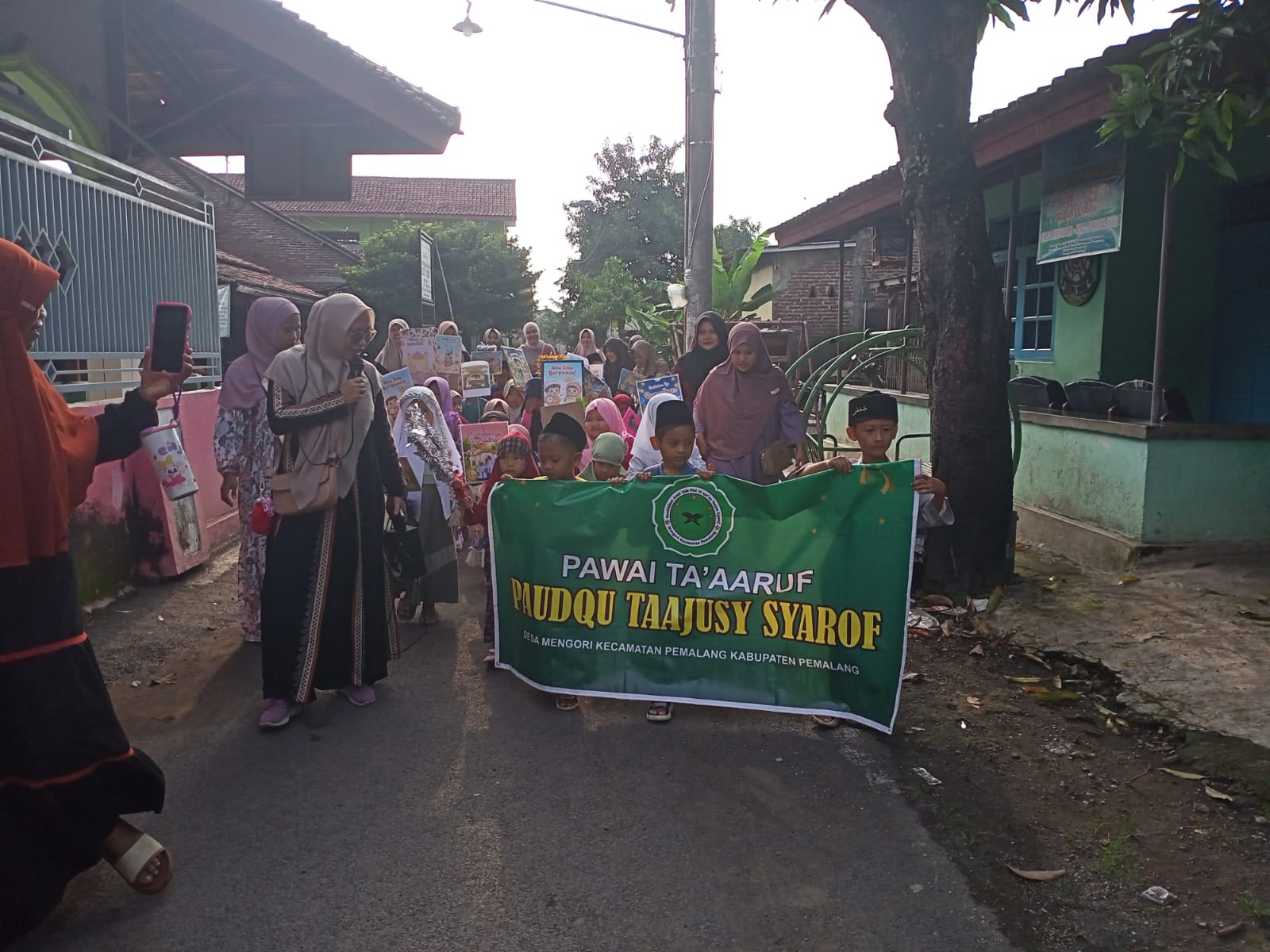 Usai berdoa, iring-iringan konvoi berjalan kaki pun dimulai. Dengan langkah-langkah kecil yang penuh semangat, para santri membawa berbagai atribut kreatif dan spanduk bertema Ramadhan. Rute pawai mengambil start dari lingkungan Desa Mengori, menyusuri jalanan desa, hingga berakhir di kawasan Perumahan Kota Bale Agung (KBA), Desa Saradan, Pemalang.