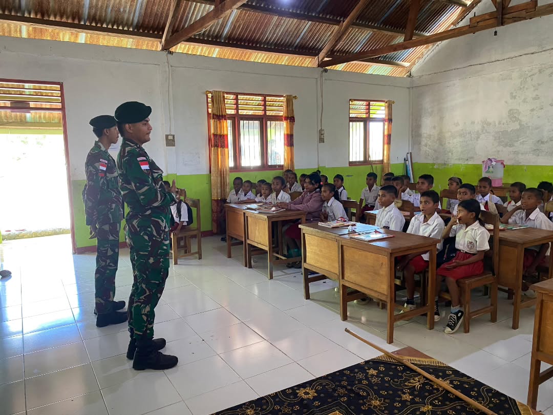 Naekake – Dalam upaya menanamkan nilai-nilai kebangsaan sejak dini sekaligus meningkatkan kesadaran hidup bersih dan sehat di lingkungan sekolah, Satgas Pamtas RI-RDTL Sektor Barat Yonarhanud 2 Kostrad Pos Naekake berikan bantuan menjadi tenaga pendidik (Gadik) di SDK Tali, Desa Naekake, Kec. Mutis, Kab. TTU. Senin (13/10)