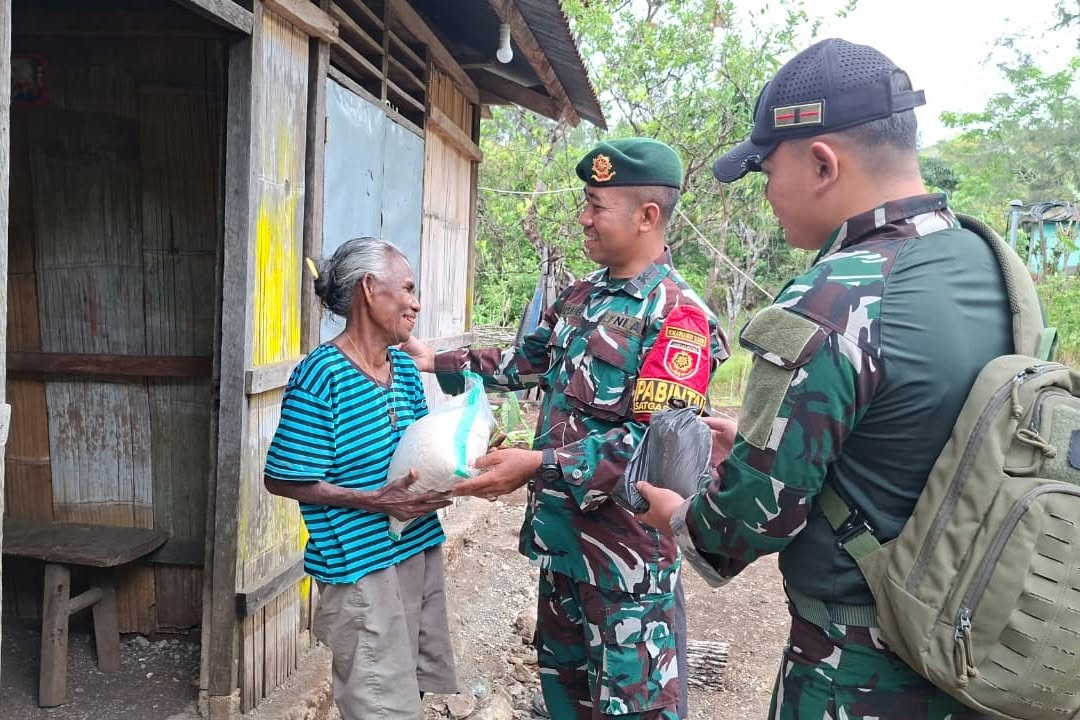 Eban – Prajurit Makosatgas Pamtas RI-RDTL Sektor Barat Yonarhanud 2 Kostrad adakan kegiatan Jumat Berkah berikan bantuan Sembako bagi masyarakat perbatasan yang membutuhkan di Desa Eban, Kec. Miomaffo Barat, Kab. TTU. Jumat (17/10).