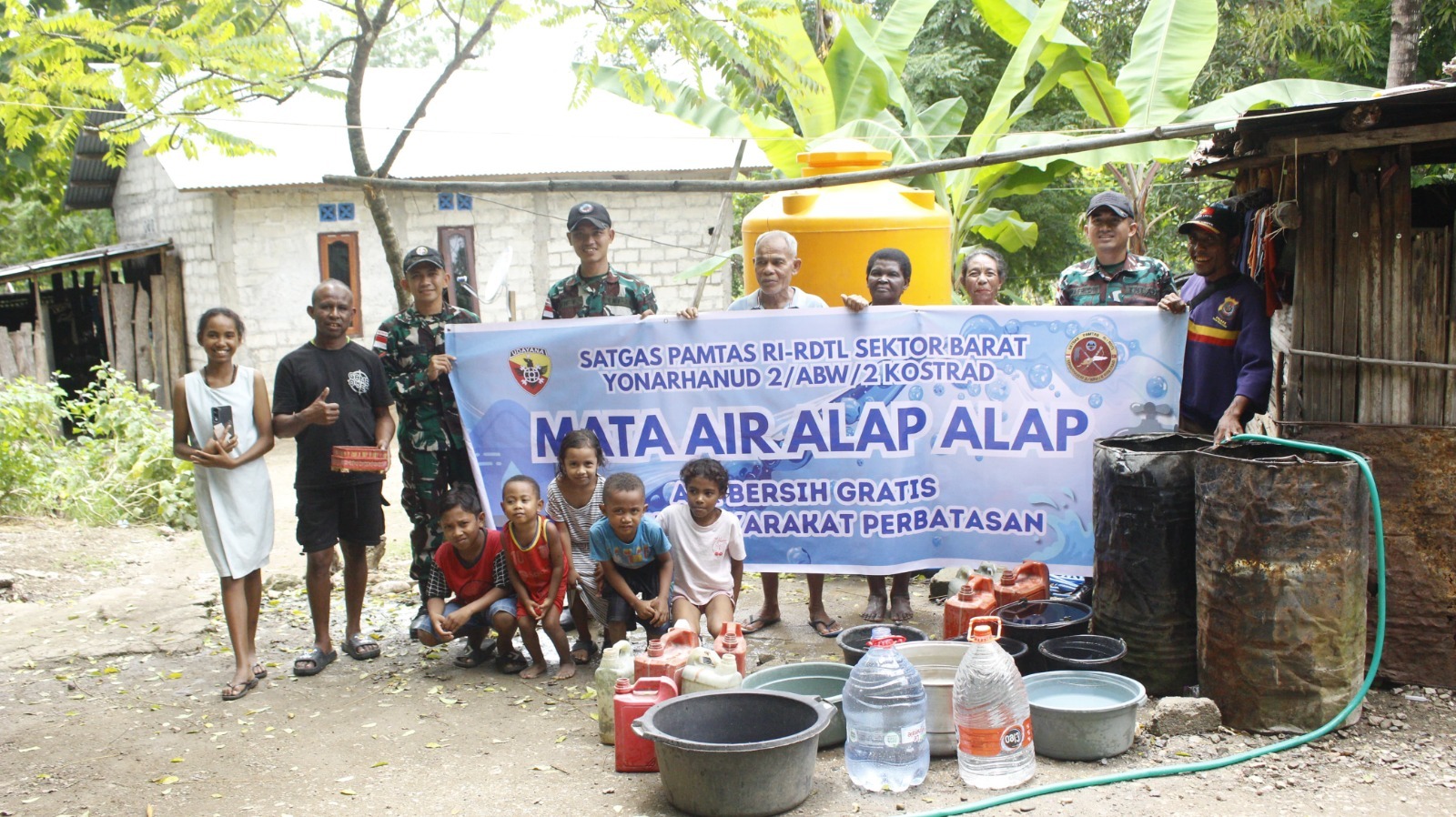 Fatumuti — Menanggapi keluhan masyarakat terkait sulitnya akses air bersih di wilayah perbatasan, Satgas Pamtas RI–RDTL Sektor Barat Yonarhanud 2 Kostrad Pos Perwakilan melaksanakan aksi sosial berupa pembagian air bersih kepada warga di Desa Fatumuti, Kecamatan Noemuti, Kabupaten Timor Tengah Utara (TTU), Kamis (26/03/2026).