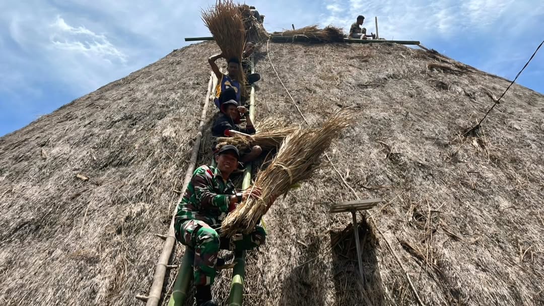 Belu, Nusa Tenggara Timur — Prajurit Pos Fohululik Satgas Pamtas RI-RDTL Yonarmed 12 Kostrad kembali menunjukkan kepedulian dan kedekatannya dengan masyarakat perbatasan melalui kegiatan karya bakti renovasi rumah adat di Desa Maudemu, Kecamatan Lamaknen, Kabupaten Belu.