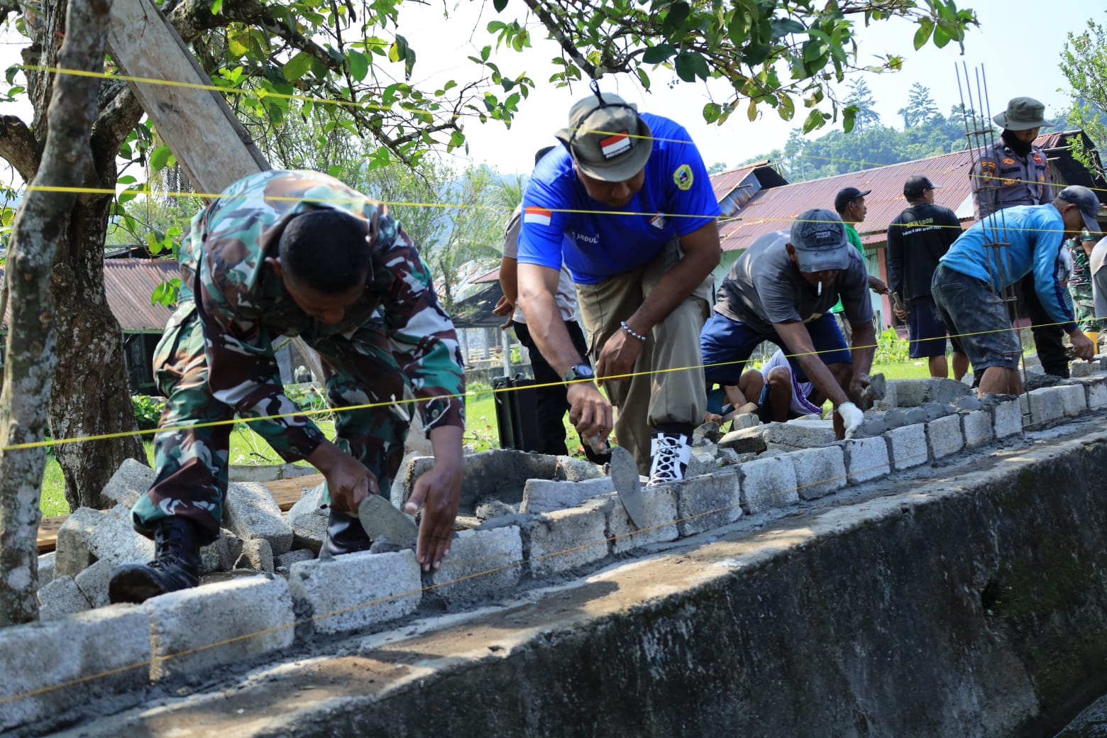Meski terik matahari menyengat, tampak personel Satgas dan masyarakat tetap bersemangat menyusun batu bata, mencampur adukan semen, serta mengangkut material bangunan secara bergotong royong. Semangat kerja sama dan kebersamaan terlihat jelas di lapangan, mencerminkan kemanunggalan TNI dan rakyat. Pembangunan pagar jalan ini kini telah memasuki hari ke-7 pelaksanaan, dan hasilnya mulai tampak nyata. Deretan pagar bata yang tersusun rapi memperlihatkan kemajuan signifikan dari upaya keras personel Satgas bersama warga.