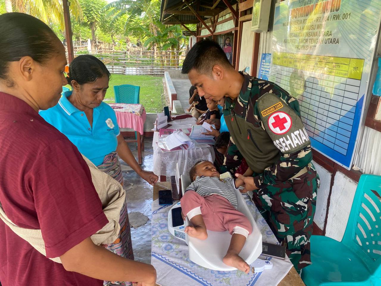Wini – Satgas Pamtas RI–RDTL Sektor Barat Yonarhanud 2 Kostrad Pos Wini kembali menunjukkan kepedulian terhadap kesehatan masyarakat perbatasan khususnya balita, dengan melaksanakan kegiatan Posyandu bersama warga di Desa Wini, Kec. Insana Utara, Kab. TTU. Senin (15/12)