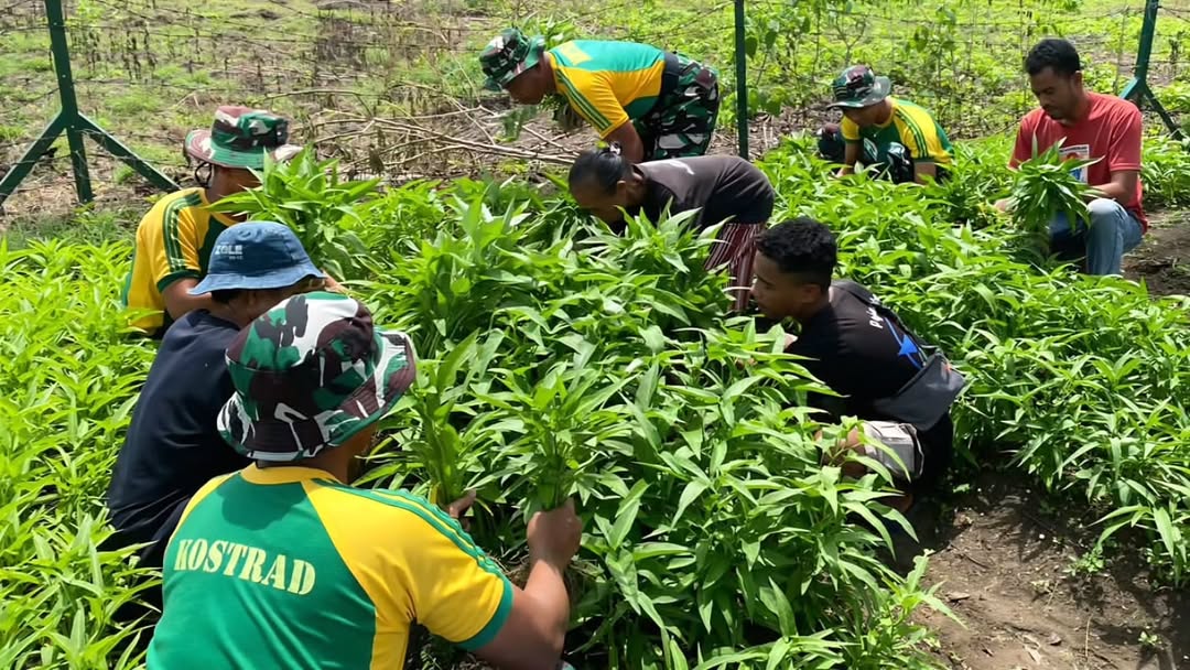 Belu, Nusa Tenggara Timur — Prajurit Pos Dafala Satgas Pamtas RI-RDTL Yonarmed 12 Kostrad melaksanakan kegiatan pembinaan teritorial (Binter) berupa panen bersama masyarakat di lahan sayur milik Pos Dafala yang berlokasi di Desa Dafala, Kecamatan Tasifeto Timur, Kabupaten Belu, NTT. Kegiatan ini menjadi wujud nyata kepedulian TNI terhadap upaya peningkatan ketahanan pangan di wilayah perbatasan.