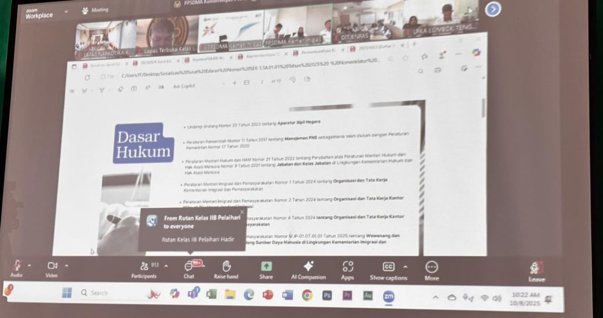 Dalam rangka mendukung implementasi kebijakan terbaru di lingkungan Kementerian Imigrasi dan Pemasyarakatan, Lembaga Pemasyarakatan (Lapas) Narkotika Kelas IIA Karang Intan mengikuti kegiatan Sosialisasi tentang Tata Cara Penyesuaian Nomenklatur Jabatan Pelaksana, Rabu (8/10). Kegiatan yang dilaksanakan secara zoom meeting tersebut diikuti oleh Kalapas Yugo Indra Wicaksi, Kasubag Tata Usaha, Kaur Kepegawaian dan Keuangan, serta Staf Kepegawaian dan keuangan bertempat di Aula Lapas Narkotika Karang Intan.