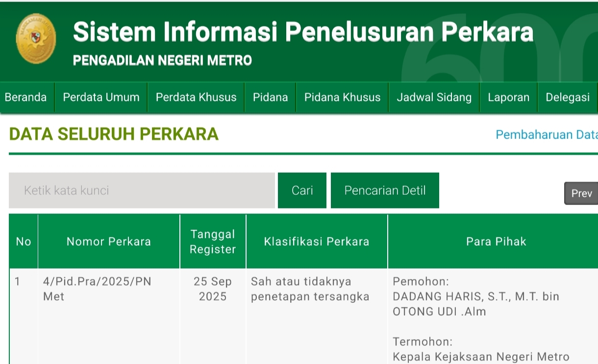 Dari situs SIPP PN Metro, diketahui bahwa pihak DADANG HARIS, S.T., M.T. bin OTONG UDI .Alm telah melakukan upaya hukum dengan mendaftarkan dan mem Pra Peradilan kan Kajari Kota Metro di PN Kota Metro atas Sah atau tidaknya penetapan tersangka terhadap dirinya.