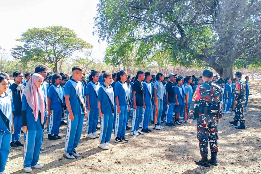 Wini – Satgas Pamtas RI-RDTL Sektor Barat Yonarhanud 2 Kostrad Pos Wini mengadakan kegiatan terpadu berupa pelatihan Peraturan Baris Berbaris (PBB) dan pendistribusian gizi tambahan yang dilaksanakan di SMP Negeri Wini, Kec. Insana Utara, Kab. TTU. Senin (27/10).