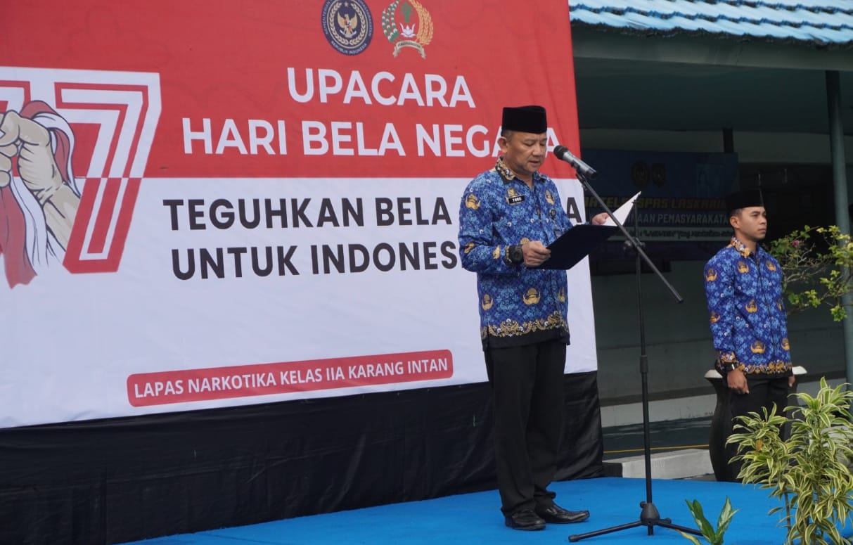 Lembaga Pemasyarakatan (Lapas) Narkotika Kelas IIA Karang Intan melaksanakan Upacara Peringatan ke-77 Hari Bela Negara yang digelar di lapangan dalam Lapas Narkotika Karang Intan, Jum’at (19/12). Kegiatan ini diikuti oleh jajaran petugas serta perwakilan Warga Binaan dengan tertib dan penuh khidmat sebagai wujud penanaman nilai-nilai cinta tanah air dan nasionalisme di lingkungan pemasyarakatan.