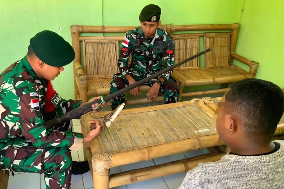 Belu, NTT – Satgas Pamtas RI-RDTL Sektor Timur Yonarmed 12 Kostrad Pos Motaain menerima dua pucuk senjata rakitan dari salah satu warga berinisial P (47 tahun) yang secara sukarela menyerahkan senjata miliknya kepada prajurit TNI. Adapun dua senjata tersebut terdiri dari satu pucuk senjata rakitan laras panjang dan satu pucuk senjata rakitan jenis pistol.