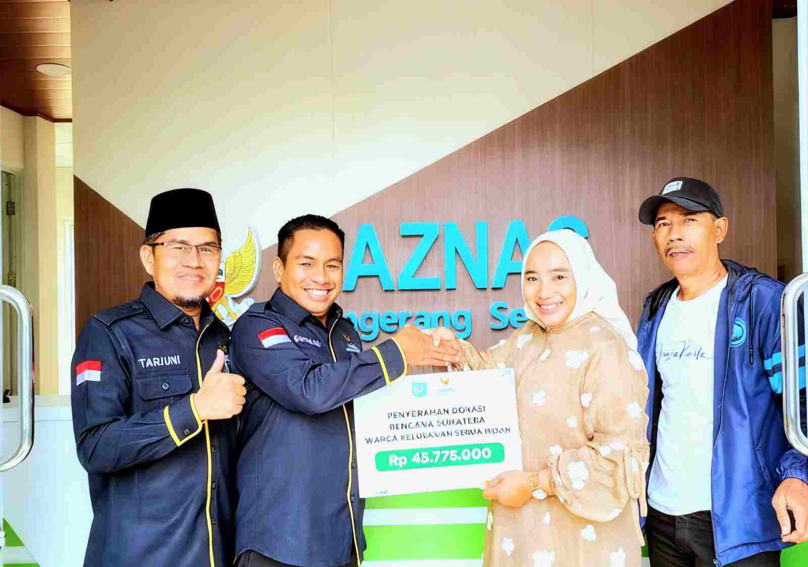 Total donasi yang berhasil dihimpun mencapai Rp45.775.000. Bantuan tersebut diserahkan langsung oleh Lurah Serua Indah, Nurshobah, dan diterima oleh Kepala Bidang I Baznas Kota Tangerang Selatan, H. Yaya Supriyadi, didampingi Wakil Ketua III Baznas, H. Tarjuni, MM. Penyerahan donasi berlangsung di Kantor Baznas Kota Tangsel pada Jumat (30/1/2026).