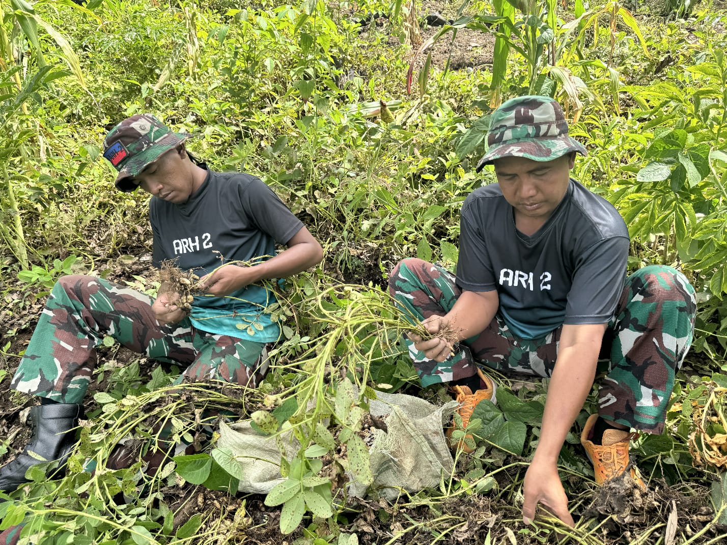 Sunsae – Satgas Pamtas RI-RDTL Sektor Barat Yonarhanud 2 Kostrad Pos Nelu membantu warga perbatasan memanen kacang tanah di Desa Sunsea, Kec. Naibenu, Kab. TTU. Jumat (10/04)