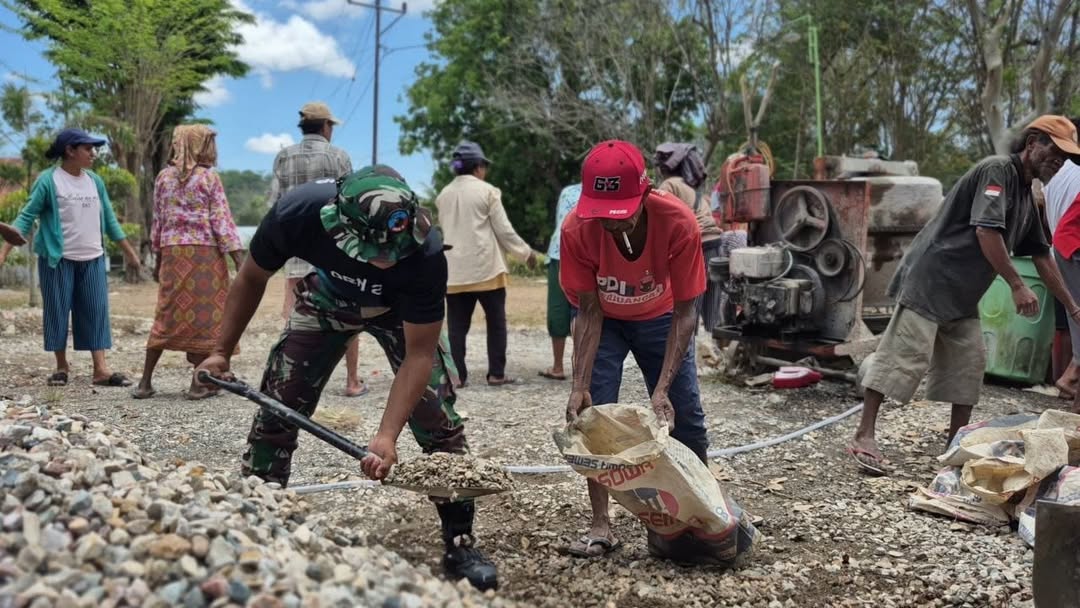 Napan Bawah — Dalam semangat pengabdian kepada masyarakat perbatasan, prajurit Satuan Tugas Pengamanan Perbatasan Republik Indonesia–Republik Demokratik Timor Leste (Satgas Pamtas RI-RDTL) Sektor Barat Pos Napan Bawah turut serta mendukung pembangunan Gereja Hati Kudus Yesus Sainoni yang berlokasi di Kecamatan Bikomi Utara, Kabupaten Timor Tengah Utara, Nusa Tenggara Timur. Senin (29/9/2025).